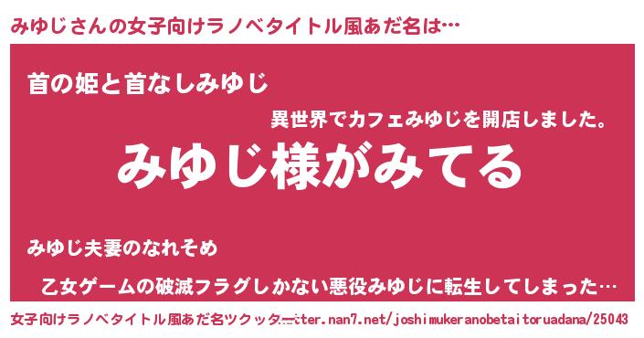 | 男性向けラノベタイトル風あだ名 | 『みゆじの嫁は女の子じゃないと思った?』 |