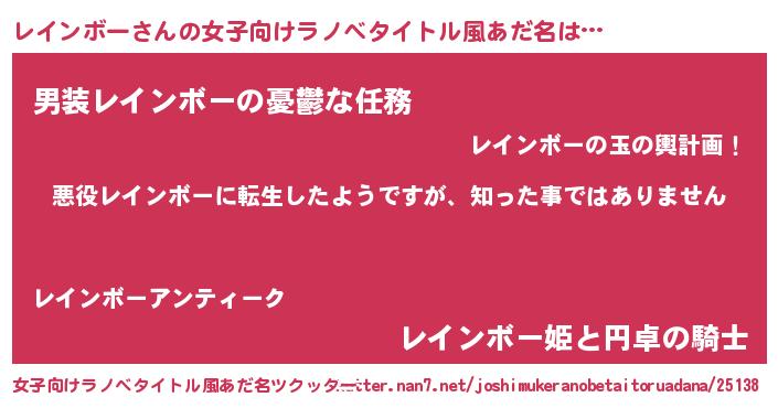 | 男性向けラノベタイトル風あだ名 | 『この素晴らしい世界にレインボーを!』 |