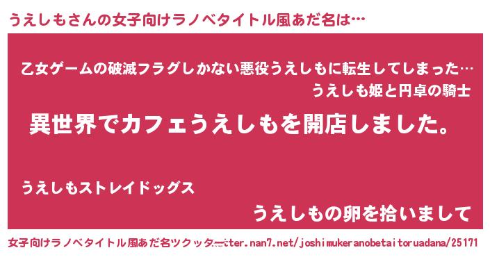 うえしもさんの女子向けラノベタイトル風あだ名は… 『異世界でカフェうえしもを開店しました。』『乙女ゲームの破滅フラグしかない悪役うえしもに転生してしまった…』『うえしもの卵を拾いまして』 ツクッター #女子向けラノベタイトル風あだ名ツクッター http://tkutter.nan7.net/joshimukeranobetaitoruadana/25171/