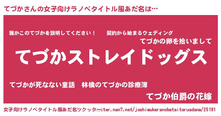 | 男性向けラノベタイトル風あだ名 | 『Re:てづかから始める異世界生活』 |