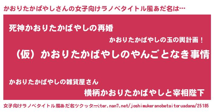 かおりたかばやしさんの女子向けラノベタイトル風あだ名は… 『(仮)かおりたかばやしのやんごとなき事情』『死神かおりたかばやしの再婚』『横柄かおりたかばやしと宰相陛下』 ツクッター #女子向けラノベタイトル風あだ名ツクッター http://tkutter.nan7.net/joshimukeranobetaitoruadana/25185/