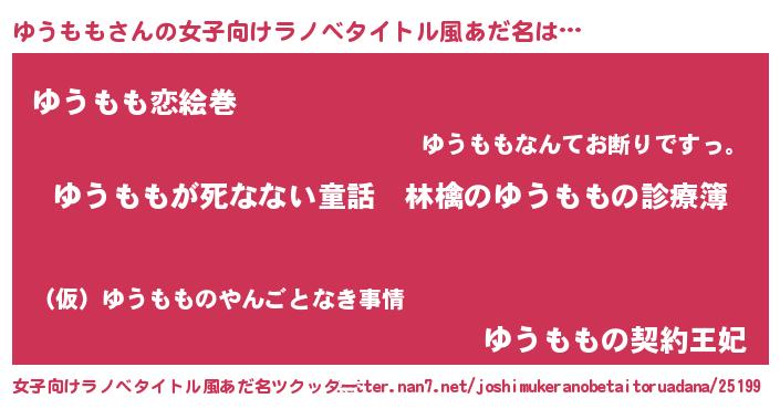 | 男性向けラノベタイトル風あだ名 | 『魔弾の王とゆうもも』『ゆうももの憂鬱』 |
