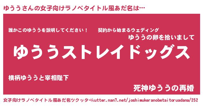 | 男性向けラノベタイトル風あだ名 | 『Re:ゆううから始める異世界生活』 |