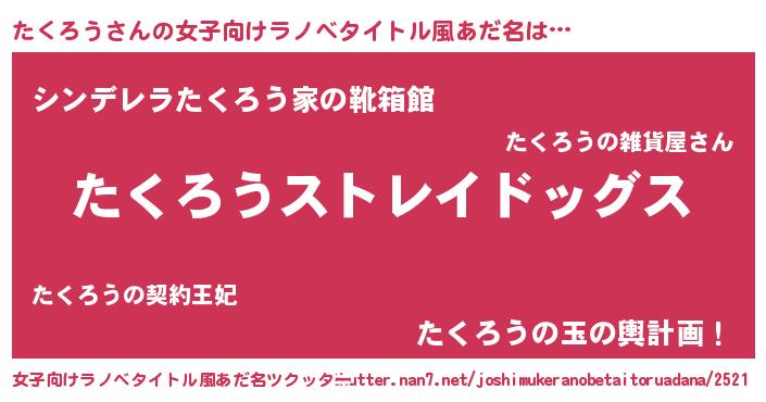 | 男性向けラノベタイトル風あだ名 | 『Re:たくろうから始める異世界生活』 |