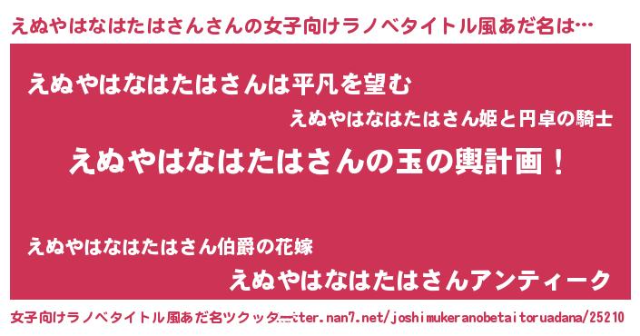 | 男性向けラノベタイトル風あだ名 | 『えぬやはなはたはさん~年齢イコール彼女いない歴の魔法使い~』 |