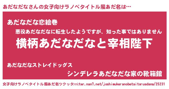 | 男性向けラノベタイトル風あだ名 | 『あだなだなに滅ぼされるだけの簡単なお仕事です』 |