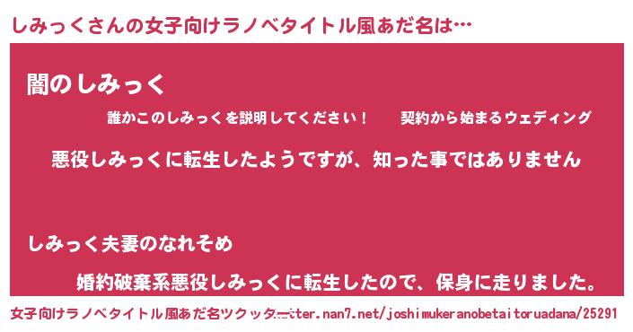 | 男性向けラノベタイトル風あだ名 | 『この素晴らしい世界にしみっくを!』 |