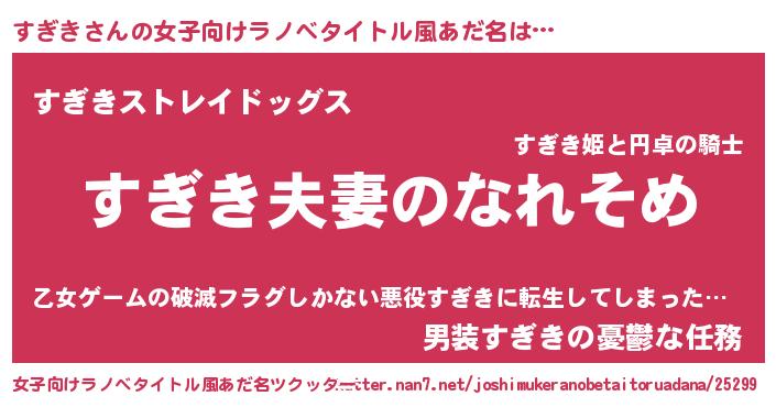 | 男性向けラノベタイトル風あだ名 | 『おまえをオタクにしてやるから、俺をすぎきにしてくれ! 』 |