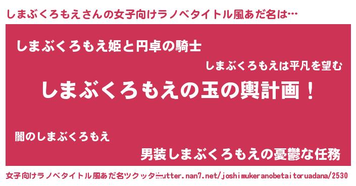 | 男性向けラノベタイトル風あだ名 | 『しまぶくろもえ~年齢イコール彼女いない歴の魔法使い~』 |