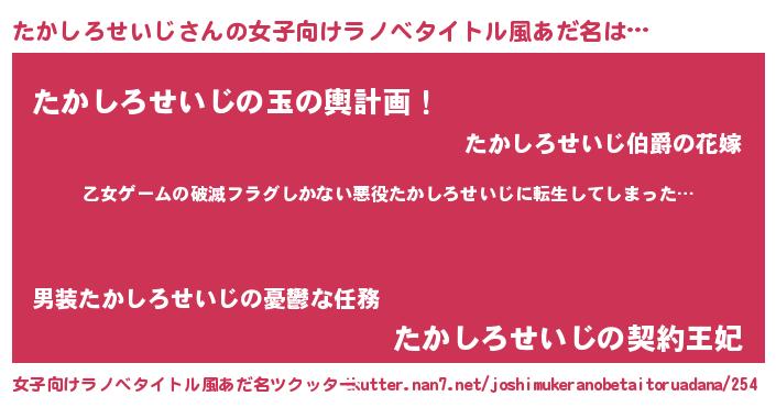 | 男性向けラノベタイトル風あだ名 | 『この素晴らしい世界にたかしろせいじを!』 |