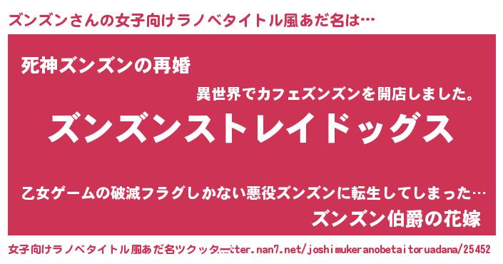 | 男性向けラノベタイトル風あだ名 | 『Re:ズンズンから始める異世界生活』 |