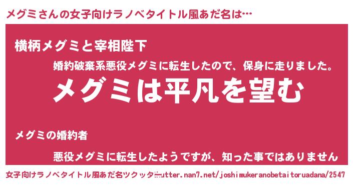 | 男性向けラノベタイトル風あだ名 | 『ダンジョンにメグミを求めるのは間違っているだろうか』 |