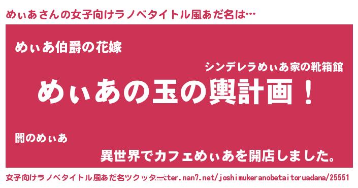 | 男性向けラノベタイトル風あだ名 | 『めぃあ~年齢イコール彼女いない歴の魔法使い~』 |