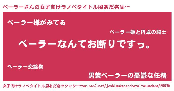 ベーラーさんの女子向けラノベタイトル風あだ名は… 『ベーラーなんてお断りですっ。』『ベーラー様がみてる』『男装ベーラーの憂鬱な任務』 ツクッター #女子向けラノベタイトル風あだ名ツクッター http://tkutter.nan7.net/joshimukeranobetaitoruadana/25570/