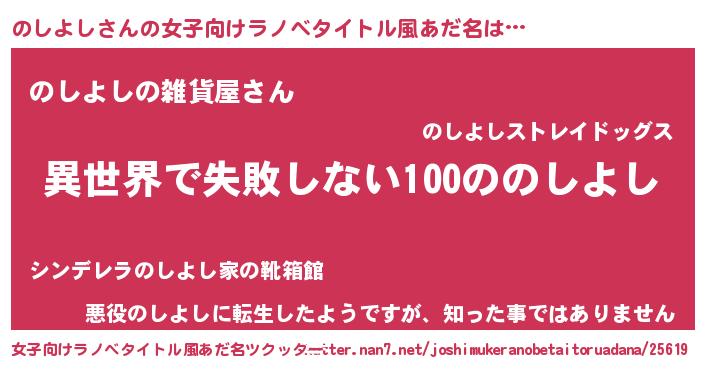 | 男性向けラノベタイトル風あだ名 | 『のしよしという概念が存在しない退屈な世界 』 |