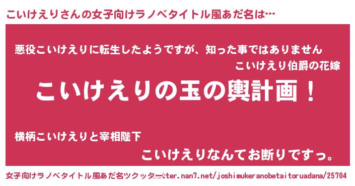 こいけえりさんの女子向けラノベタイトル風あだ名は… 『こいけえりの玉の輿計画!』『悪役こいけえりに転生したようですが、知った事ではありません』『こいけえりなんてお断りですっ。』 ツクッター #女子向けラノベタイトル風あだ名ツクッター http://tkutter.nan7.net/joshimukeranobetaitoruadana/25704/