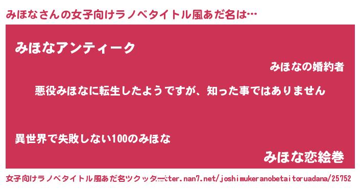 | 胡散臭い通販商品みたいなあだ名 | 『あなたにだけ特別に提供する100年もののヴィンテージワイン…その名も「みほな」』 |