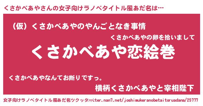 くさかべあやさんの女子向けラノベタイトル風あだ名は… 『くさかべあや恋絵巻』『(仮)くさかべあやのやんごとなき事情』『横柄くさかべあやと宰相陛下』 ツクッター #女子向けラノベタイトル風あだ名ツクッター http://tkutter.nan7.net/joshimukeranobetaitoruadana/25777/
