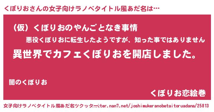 | 男性向けラノベタイトル風あだ名 | 『誰もが恐れるあのくぼりおが、ぼくの専属メイドになるようです。』 |