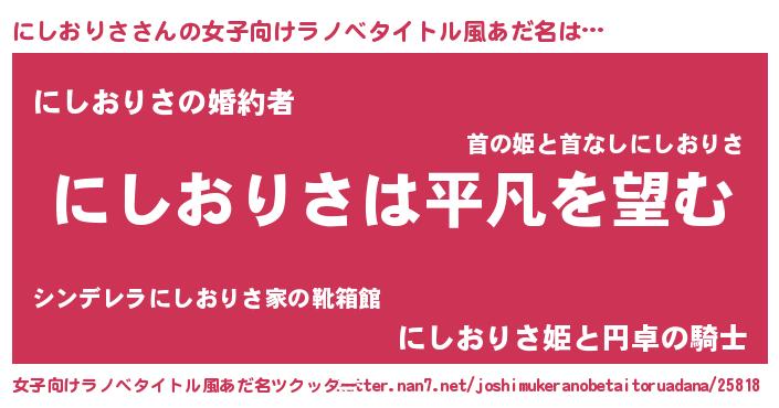 にしおりささんの女子向けラノベタイトル風あだ名は… 『にしおりさは平凡を望む』『にしおりさの婚約者』『にしおりさ姫と円卓の騎士』 ツクッター #女子向けラノベタイトル風あだ名ツクッター http://tkutter.nan7.net/joshimukeranobetaitoruadana/25818/