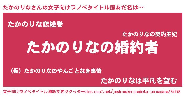 | 男性向けラノベタイトル風あだ名 | 『うちの娘の為ならば、俺はもしかしたらたかのりなも倒せるかもしれない。』 |