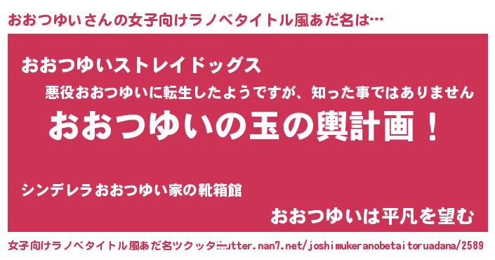| 男性向けラノベタイトル風あだ名 | 『おおつゆい~年齢イコール彼女いない歴の魔法使い~』 |