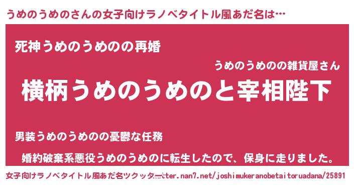 | 男性向けラノベタイトル風あだ名 | 『うめのうめのに滅ぼされるだけの簡単なお仕事です』 |