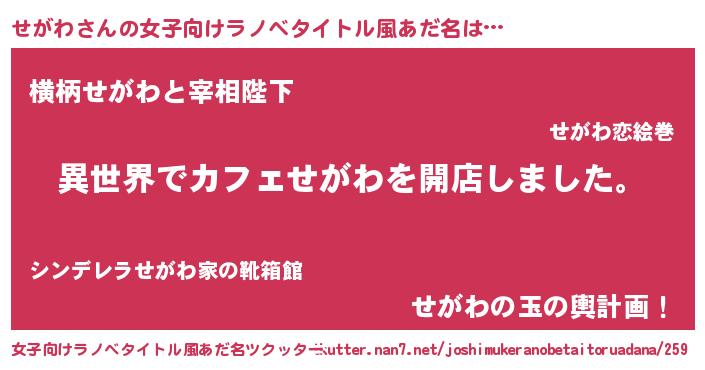 | 男性向けラノベタイトル風あだ名 | 『誰もが恐れるあのせがわが、ぼくの専属メイドになるようです。』 |