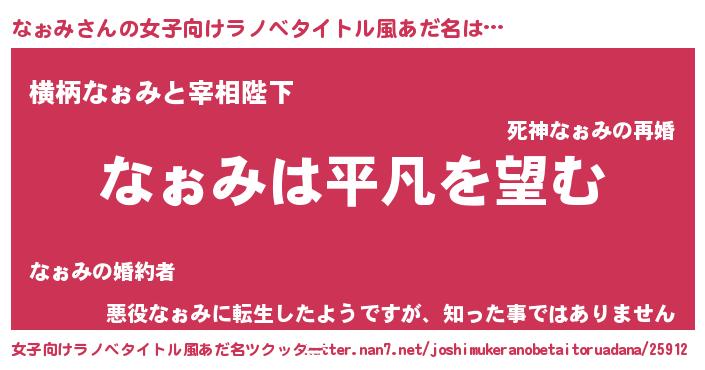 | 男性向けラノベタイトル風あだ名 | 『ダンジョンになぉみを求めるのは間違っているだろうか』 |