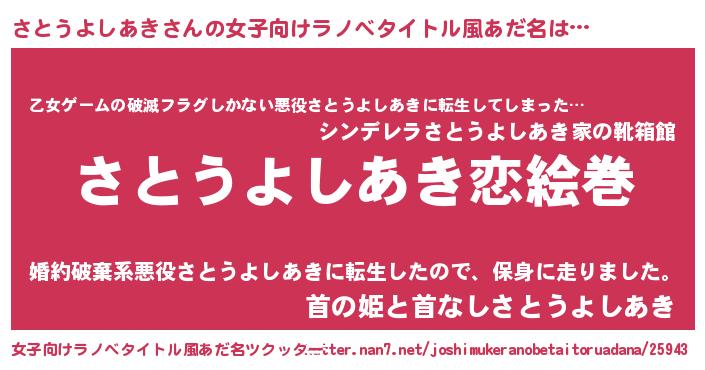 | 男性向けラノベタイトル風あだ名 | 『おまえをオタクにしてやるから、俺をさとうよしあきにしてくれ! 』 |