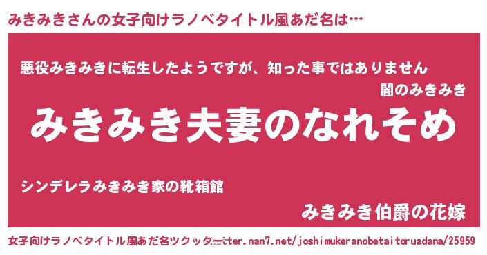 | 男性向けラノベタイトル風あだ名 | 『おまえをオタクにしてやるから、俺をみきみきにしてくれ! 』 |