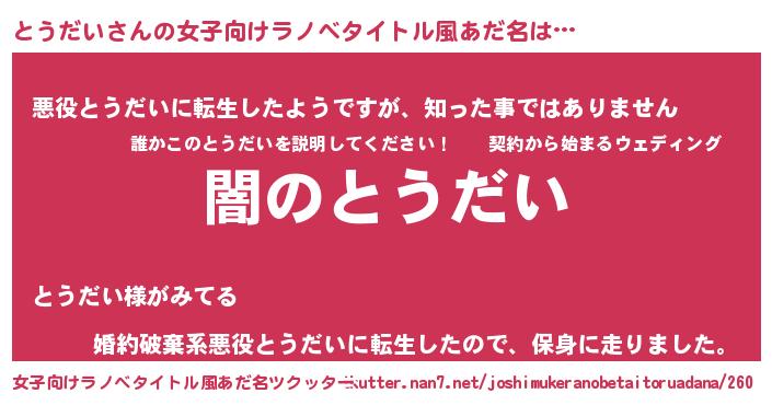 | 男性向けラノベタイトル風あだ名 | 『Re:とうだいから始める異世界生活』 |