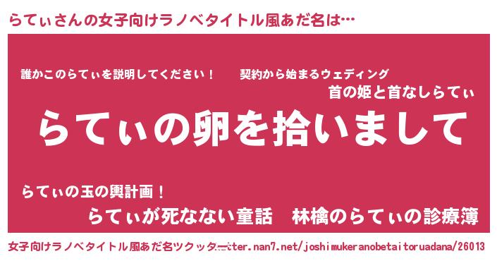 | 男性向けラノベタイトル風あだ名 | 『らてぃの嫁は女の子じゃないと思った?』 |