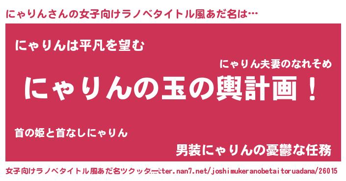 | 男性向けラノベタイトル風あだ名 | 『にゃりん~年齢イコール彼女いない歴の魔法使い~』 |