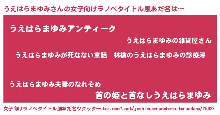 | 男性向けラノベタイトル風あだ名 | 『魔弾の王とうえはらまゆみ』 |
