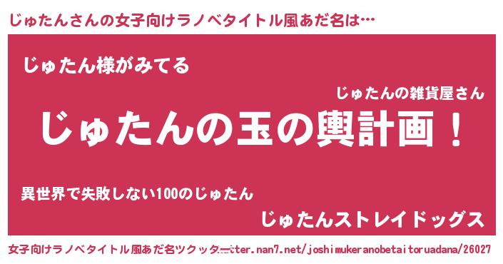 | 男性向けラノベタイトル風あだ名 | 『転生したらじゅたんだった件』 |