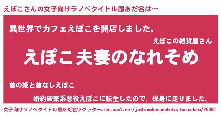 | 男性向けラノベタイトル風あだ名 | 『おまえをオタクにしてやるから、俺をえぽこにしてくれ! 』 |
