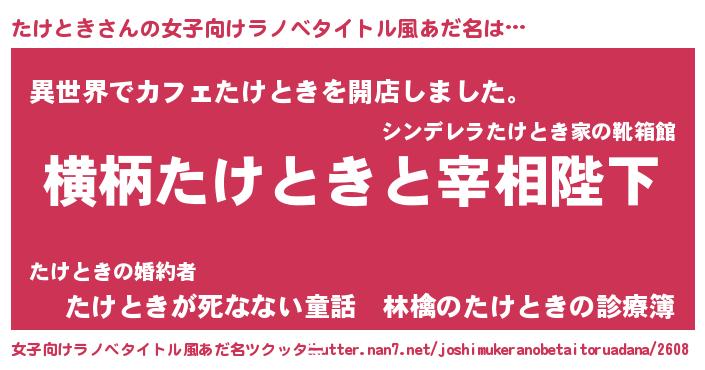 | 男性向けラノベタイトル風あだ名 | 『たけときに滅ぼされるだけの簡単なお仕事です』 |