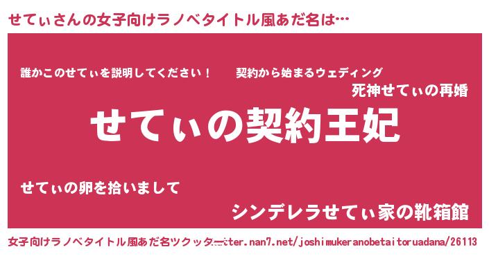 | 男性向けラノベタイトル風あだ名 | 『せてぃという概念が存在しない退屈な世界 』 |