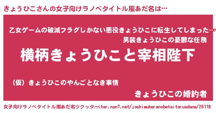 | 男性向けラノベタイトル風あだ名 | 『きょうひこに滅ぼされるだけの簡単なお仕事です』 |