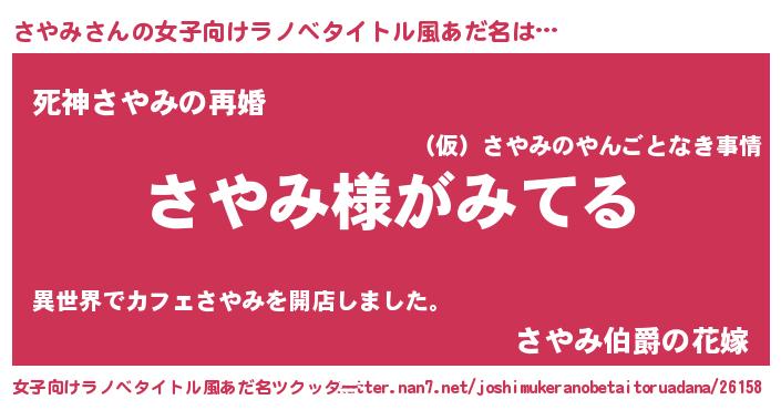 さやみさんの女子向けラノベタイトル風あだ名は… 『さやみ様がみてる』『死神さやみの再婚』『さやみ伯爵の花嫁』 ツクッター #女子向けラノベタイトル風あだ名ツクッター http://tkutter.nan7.net/joshimukeranobetaitoruadana/26158/