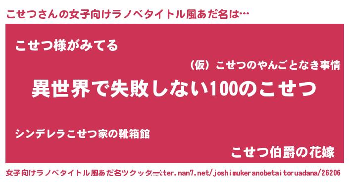| 男性向けラノベタイトル風あだ名 | 『こせつという概念が存在しない退屈な世界 』 |