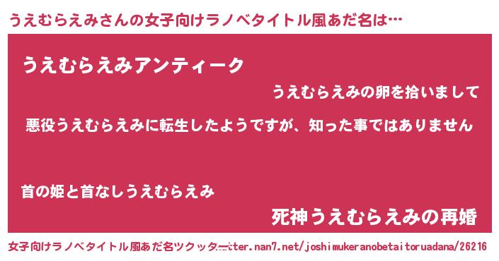 | 男性向けラノベタイトル風あだ名 | 『この素晴らしい世界にうえむらえみを!』 |