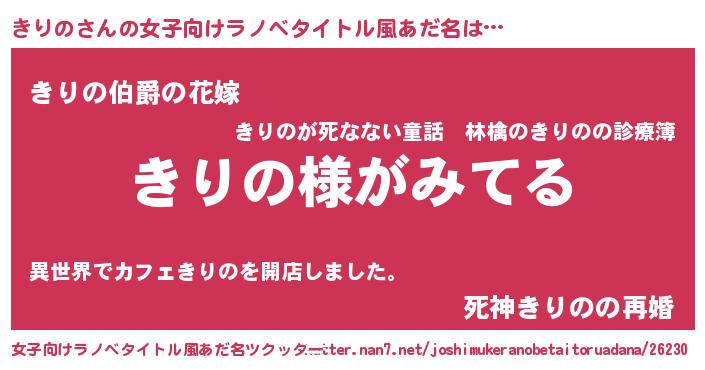 | 男性向けラノベタイトル風あだ名 | 『きりのの嫁は女の子じゃないと思った?』 |