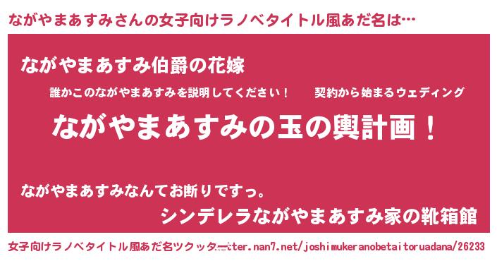 | 男性向けラノベタイトル風あだ名 | 『ながやまあすみ~年齢イコール彼女いない歴の魔法使い~』 |