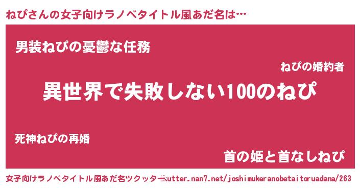 | 男性向けラノベタイトル風あだ名 | 『ねぴという概念が存在しない退屈な世界 』 |