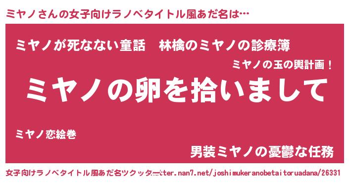 | 男性向けラノベタイトル風あだ名 | 『ダンジョンにミヤノを求めるのは間違っているだろうか』 |