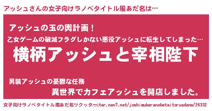 | 男性向けラノベタイトル風あだ名 | 『アッシュに滅ぼされるだけの簡単なお仕事です』 |