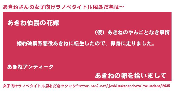 | 男性向けラノベタイトル風あだ名 | 『アキネスレイヤー』『あきねの憂鬱』 |