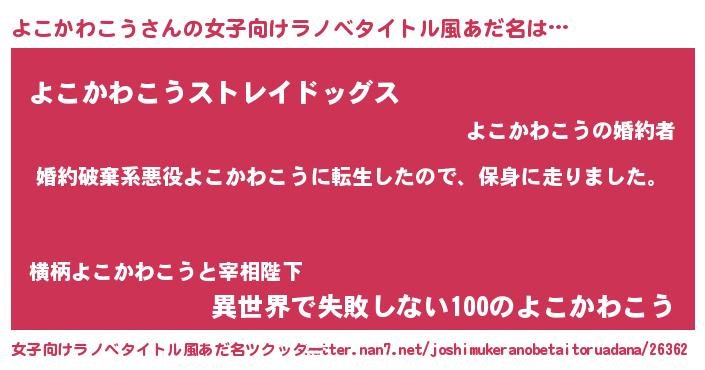 よこかわこうさんの女子向けラノベタイトル風あだ名は… 『婚約破棄系悪役よこかわこうに転生したので、保身に走りました。』『よこかわこうストレイドッグス』『異世界で失敗しない100のよこかわこう』 ツクッター #女子向けラノベタイトル風あだ名ツクッター http://tkutter.nan7.net/joshimukeranobetaitoruadana/26362/